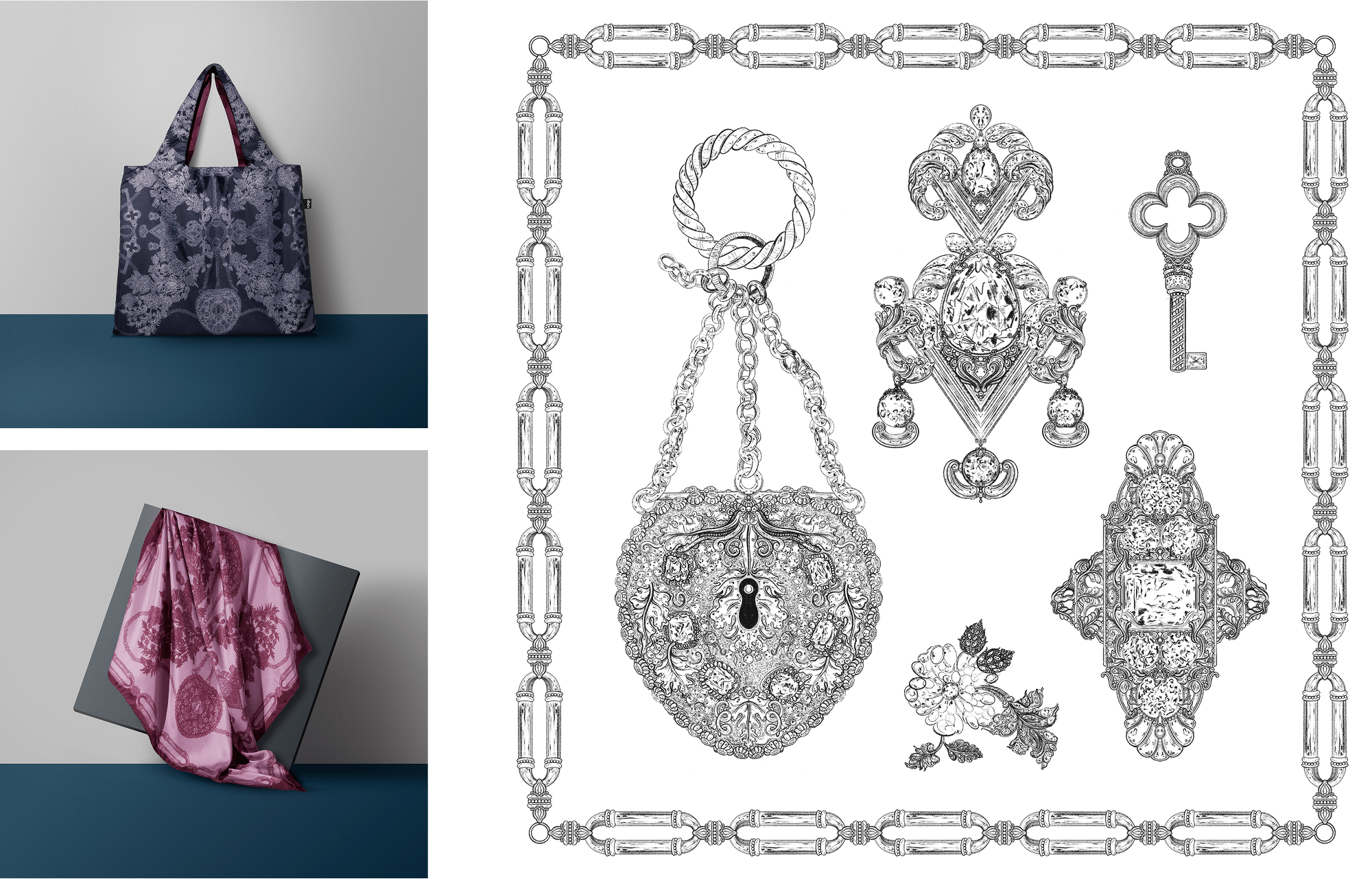 A series of intricate illustrations and a silk scarf pattern design featuring four pieces from the jewellery archives for an exclusive range of accessories, released alongside their Cartier exhibition in April 2025.